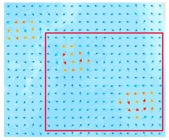 This paper selects the flow field data whose longitudes are from 11 E to 30 E and whose latitudes are from 44 S to 35 S, to further verify the effect and superiority of this method for feature retention. There are four main irregular vortices and two high-speed currents in this data. In view of the above experiments, it is verified that the method of this paper can retain features better than equal sampling, so stratified sampling is selected for comparison with the method in this paper. The criterion of stratified sampling is made according to whether it is a feature area. The sampling step size is in accordance with steps 3, 5 and 7, and the results are shown in Figure 12, Figure 13 and Figure 14.