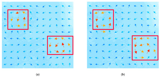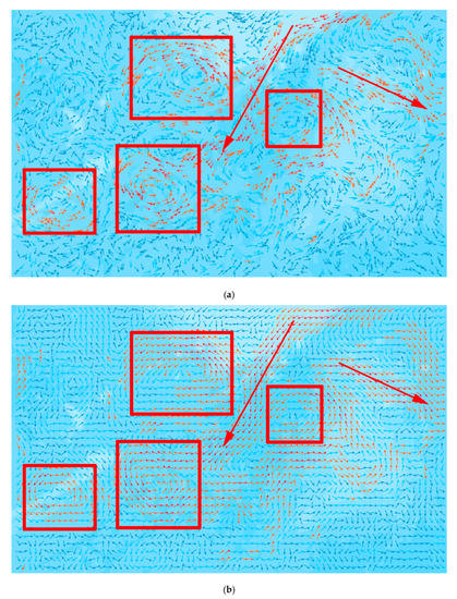 In Figure 9, two high-speed vortices within the red square are compared, and it can be seen that the vortices shown in the weight sampling map are more balanced than those shown in the equidistant sampling method map. In addition, the range remains better.