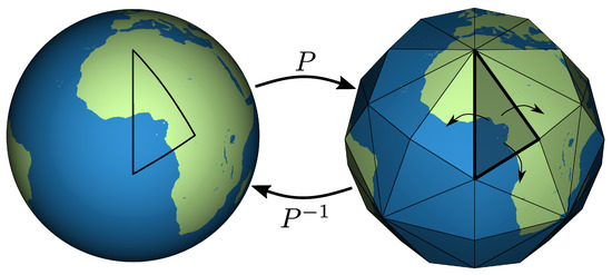 - Baumgardner, J.R.; Frederickson, P.O. Icosahedral Discretization of the Two-Sphere. Siam J. Numer. Anal. 1985, 22, 1107–1115. [Google Scholar] [CrossRef]