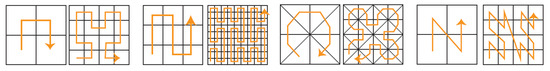 Indexing methods are generally split into three categories: hierarchical, space-filling curve and coordinate-based [2]. In hierarchical indexing, the children of a cell inherit a prefix or a postfix from the index of their parent. The two advantages of this are straightforward hierarchy traversal and simple determination of the resolution of a given cell. For space-filling curves, a curve is passed over the domain of the cells, and the cells are indexed in the order that the curve intersects them (see Figure 3). Often, the curve can be refined to index more fine resolutions of the grid. The advantage of this method is that the curve can be defined to give neighbouring cells similar indices, which allows for efficient range queries. In coordinate based indexing, a coordinate system is defined on the domain of the cells, and the cells are indexed based on taking discrete steps along the coordinate directions. The advantage here is that many operations are efficient and straightforward, but this method works best for regular grids in which the cells are all the same size and shape.
