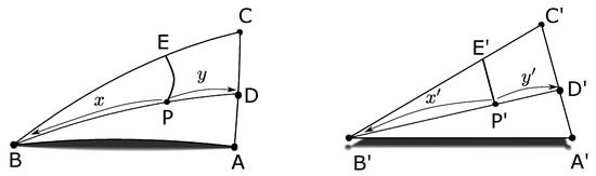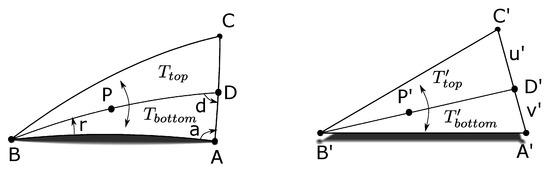 To project points on the Earth to and from points on the DT, the Slice and Dice projection presented by van Leeuwen and Strebe requires some minor modification [14]. As described in Reference [14], in order to map a spherical triangle to a planar triangle (see Figure 5) with constant areal scale, the two triangles are divided into infinitesimal cells. As long as the cells are mapped to each other with a constant areal scale everywhere on the triangles, the mapping is equal area. In the first step of the projection (see Figure 5), a point P within the spherical triangle is to be projected onto an unknown point within the planar triangle . In order for the projection to be equal area, the spherical triangle is partitioned through the point P and a corresponding partitioning through the projected point is created such that areal scale is maintained for the pieces to be projected. To accomplish this, the centre of projection is chosen to be vertex B in the spherical triangle. Great circle arcs emanating from vertex B and crossing great circle arc at point D in the spherical triangle will be projected to straight lines emanating from vertex and crossing edge at point in the planar triangle. The great circle arc emanating from B through point P cuts the spherical triangle into two parts with areas and . As shown in Reference [14], the spherical and planar divisions are proportioned to the linear parameterization of where and are shown in Figure 5: