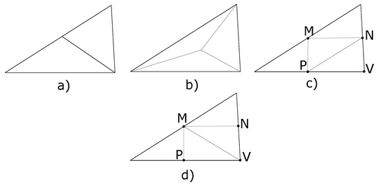 To define a multi-resolution grid system using the DT, we need a refinement method. There are many different refinement choices for a DGGS, which are detailed in Reference [2]. Figure 7 shows some common choices for refining triangles. Since the initial triangles of a DT are not equilateral, and we wish to preserve area and compactness, it is necessary to use a refinement such as (a), (c) or (d) in Figure 7. The 1:3 refinement shown in (b) is disadvantageous because recursive applications cause an unbounded reduction in compactness as subdivision level increases. Figure 7 (c) and (d) do not have this problem making them more common for DGGS refinement. For both refinements (c) and (d), it is necessary to determine the midpoint of the edges denoted by M, N and P. Notice that the edge denoted by in refinement (c) is replaced by in refinement (d), where M is the midpoint of the longest edge of the original triangle.