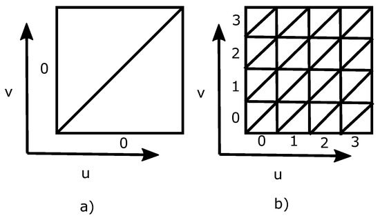 (a) Connectivity maps can be assigned to two adjacent triangles to form a quadrilateral domain parameterized by u and v ranging from 0 to 1. (b) Applying traditional 1:4 refinement twice on a triangular connectivity map produces small quad domains within the connectivity map that can be indexed by parameters u and v.
