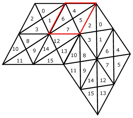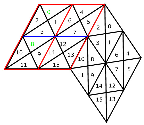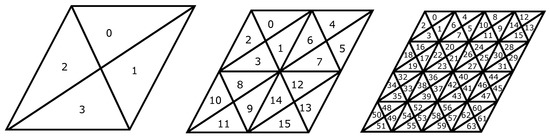 For the DT grid system, we use a specific scheme for the 30 faces corresponding to faces of the RT (see Figure 8); these 30 faces are indexed in a spiral arrangement. The connectivity between these faces is stored in a 30 × 30 array where each entry stores the transformation between face i and face j if they are adjacent. For indexing the cells inside each rhombic face, we take advantage of the regular pattern generated by refinement. For example, applying traditional 1:4 refinement to the DT allows for the connectivity map in Reference [16] to be used to efficiently index the resulting cells (see Figure 9). For a composite 1:4 refinement, we propose a modification of row-major ordering. In this method, triangles within rhombuses are indexed using blocks of Z shapes, as illustrated in Figure 10. To differentiate between different subdivision levels, the resolution level of that cell is concatenated to the cell index. This scheme was chosen for its simplicity and the efficiency of the resulting queries.