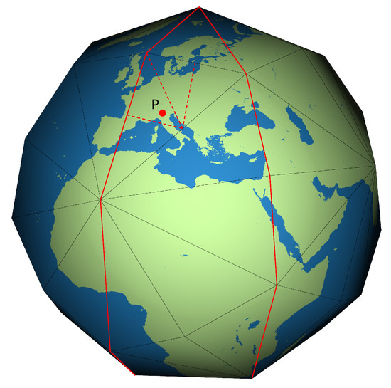 A DT with great circle arcs (longitude) between the North and South pole highlighted in red. The region between these arcs contains 12 base triangles. A point P on the Earth can be quickly checked to see if it lies within the partition created by the red arcs by simply checking its longitude. The dashed lines represent the next subdivision level. The barycentric coordinates of the point within the base triangle determines which child cell P lies in.