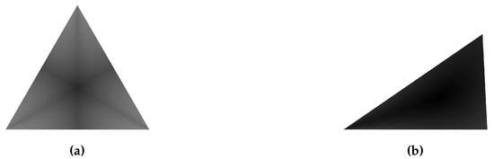 (a) Angular distortion mapped to a greyscale value across a face of an icosahedron. (b) Angular distortion mapped to a greyscale value across a face of a DT. Black is low distortion and white is high distortion. We have used the same greyscale mapping for both for direct comparison.