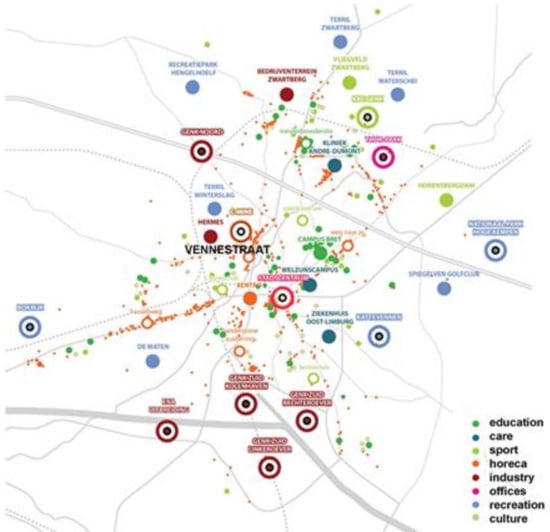 The Vennestraat is a segment in the network of local stone roads that can best be described as a real center street with a lively and diverse program and an adapted section (Figure 1) and offers a pleasant space for cyclists and pedestrians. However, such streets remain an exception within Genk. It is an alternative center for the residential areas around it and one of the poles of the city (Figure 2). Figure 2 shows the main destinations in Genk by program. With the C-mine opening in the vicinity, Vennestraat too experienced a shift and makeover not only in the urban refurbishment policy but the economic one as well. The street became more visible due to the increased traffic to and from C-mine and the administration body soon realized the two (C-mine and Vennestraat) would function better together, as a whole as opposed to as two different entities (a cultural hub and commercial street). The street became an interesting site for researchers working closely with the city of Genk to find the best scenario for Vennestraats’ development. Vennestraat offers a particular contextual lens as it is a street situated close to the city center (10 minutes away) and its space is of everyday inhabitation rather than of symbolic occupation.