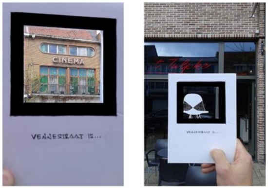 After mapping the socio-economic networks of the shops, we introduced a new artefact in the participatory process—mental images. We chose to introduce this new tool in order to uncover knowledge about the street dynamics from a different perspective (the perspective of passers-by) and trigger consciousness over the segregation phenomenon present in the street among proprietors. The definition of a mental images is that it “[…] is a unique, personal and selective representation of reality” []. This emphasizes the power of the mind as it pertains to the formation of a perception about something. Mental images are purposed to project an individual’s understanding or interpretation of the significance of a target urban space. Therefore, it is justifiable to argue that the manner in which a particular urban area is perceived is based on an individual’s experience. Mental images explore further the foundation of one’s perception of urban space, that is, whether it is a true or genuine representation of the area’s social, political, geographic, and aesthetic effect. By using this tool, we engaged participants in an introspective action in order to enable them to frame personal experiences. We do so in order to identify less visible power relations and get an insight into the moments that might have influenced their appearance. As with the socio-economic networks mapping, we used a gamified method. We gave each participant a cardboard contour through which he/she could look at the places they were talking about and ‘frame’ them as a mental image (Figure 5). The discussion was structured around six main guiding questions: (1) How would you describe the street to someone who doesn’t know it? what are the key characteristics?, (2) What is the story of the street: has anything changed in time? (do you remember stories/events, anecdotes about the street?), (3) Which are the most important shops (on the street) for you, in your eyes and why?, (4) What do you like? What do you dislike about the street? and (5) What would you like to see happen in the future?