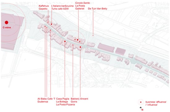 Over four months we collected mental images from both proprietors and passers-by. Most of the passers-by that were interviewed referred back to the times when the mine was still active and the street was perceived as a dirty and dangerous place. The most iconic building on the street, that brings about a sort of nostalgia over that period, is the Cinema that stands abandoned. In the same line of thought, people relate to the C-mine, a standing ovation to the past. Although apparently very important for the dynamics of the street, C-mine is seen separate from it, both spatially and functionally. Passers-by identified the spirit of the Vennestraat street with particular shops that were on the street from ‘the beginning of times’ (e.g., the butcher shop, the bakery, the shoe repairing shop). The mental images people portrayed bring to the fore shops that act as mini centers of influence, attractors on the street. Here too, as with the case of the participatory method used previously, we observe a clear separation between the ‘commercial part’ of Vennestraat and the south part of the street, the part farther away from C-mine (Figure 6 and Figure 7).