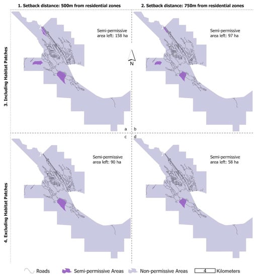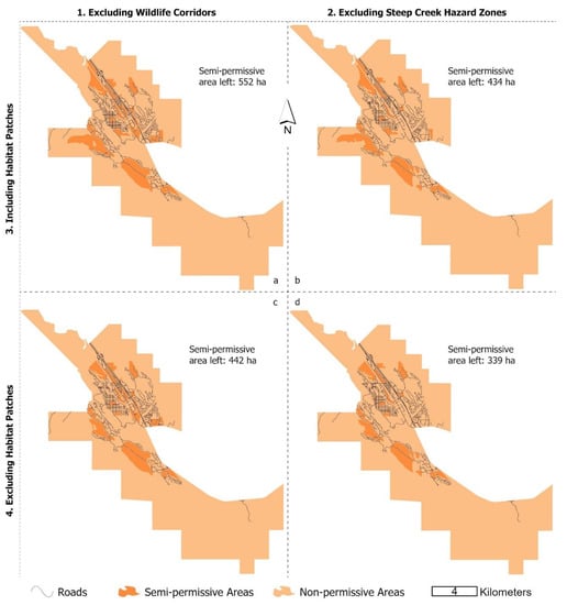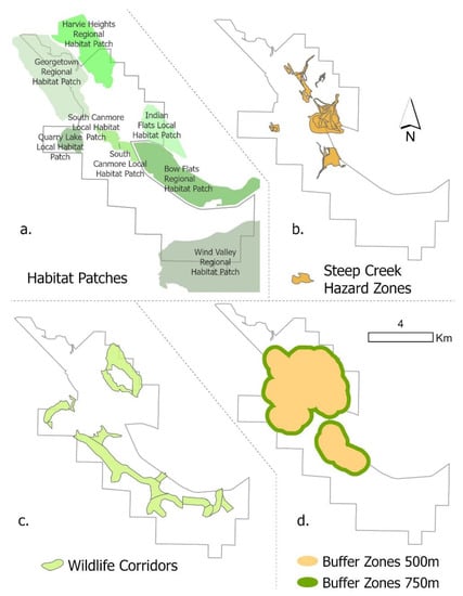Four criteria are added to corresponding legally-accessible layers as scenarios including (a) regional habitat patches, (b) steep creek hazard zones that are subject to mass wasting, (c) the wildlife corridors and (d) two setback buffer zones of 500 and 750m, respectively, away from residential zones in Canmore.