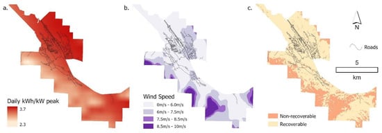 Theoretical resources (wind and solar potentials) are mapped in Figure 4a,b. The general patterns of power potential for wind and solar are the opposite: the north and west of Canmore generally has more solar potential, while the south and east of Canmore have higher wind speed. The wind classification is based on the annual average wind speed (max) of IEC wind classes [66]. The technically recoverable lands are indicated in Figure 4c.