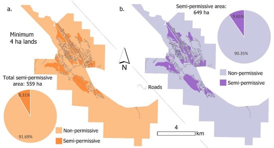 Legally accessible lands (Figure 5) in Canmore are organized according to Canmore’s land-use bylaw (LUB) [55]. There are two classes distinguished here: non-permissive lands, and semi-permissive lands. Under the semi-permissive class (darker colors in Figure 5), the land has the possibility of being developed into RE use, but only with some possible concessions between community members, stakeholders, and decision makers. The setback distances of water bodies, roads, and railways are based on LUB. Developments under lands with the non-permissive classification (lighter colors in Figure 5) are not actively considered for RE development. Apart from the LUB classification, additional legally accessible layers are also considered. Provincial parks are considered as non-permissive lands. Municipal parking lots are considered as semi-permissive lands. About 8.3% of lands (559 ha) in the town are semi-permissive for solar energy development. About 650 ha of lands are semi-permissive for wind turbine development. Due to strict land-use regulations, all lands are at least semi-permissive; none are fully permissive.