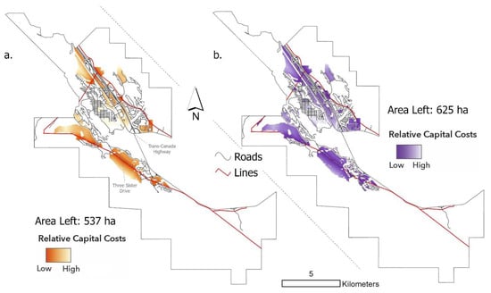The relative economic cost filtered by non-recoverable lands and non-permissive legally accessible resources are illustrated in Figure 6 for both solar (left) and wind (right) developments, demonstrated with relative economic cost gradients. About 625 ha of lands are left for wind energy development, while the area of semi-permissive lands suitable for developing solar power is about 537 ha. The most economically feasible lands are those regions long the power transmission and vehicle transportation lines. Many of those lands are in the northern and central Canmore along the Trans-Canada highway and Three Sister Drive.