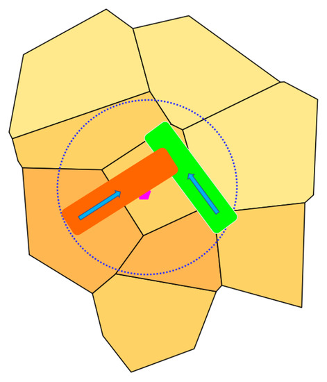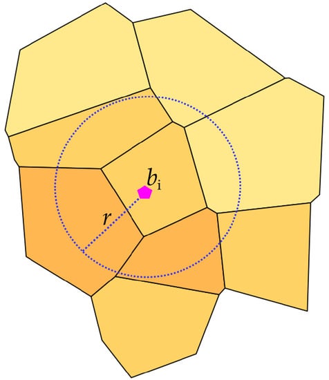 . The method we are going to introduce for the computation of the value of the exposure of buildings to the landslides is based on the conjecture that only the surroundings zones might pose a threat to them. This conjecture is inspired by the Tobler’s first law of geography []: “Everything is related to everything else, but  near things are more related than distant things.” Within this paper, a circular region of radius r, centered on the geometric centroid of , formalizes this idea. We call it  (Figure 1). An abstract r can be infinite, but for the problem at hand its value is limited.