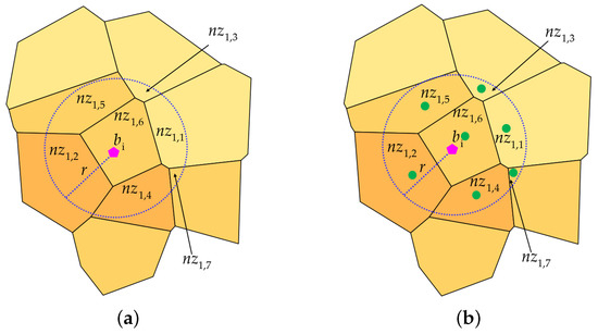 The nearest zones () inside the  about building  (a) and their centroids (the green dots) (b); (, ).