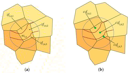 (Nearest Zones)  is a zone located inside }.  can represent either a whole zone or the portion of it result of the intersection with the  (Figure 2a).  is an overloaded notation since it rapresents both the ID of a nearest zone and its geometry.