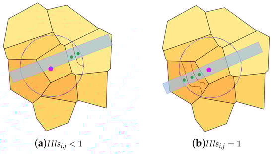(Impact Index) is a decimal value in the interval  defined as the ratio between the area of the geometry result of the operation () and the area of , (Equation (5)).  if the landslide corridor covers the whole geometry of building . The definition of set  implies that .