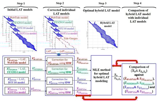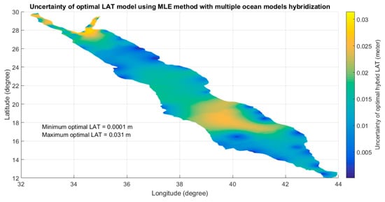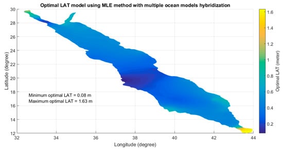 The contribution of the LAT to the MSL separation model’s uncertainty to the overall uncertainty of the national continuous chart datum when employing the individual hydrodynamic ocean model is almost half of the overall uncertainty in average []. Consequently, any significant improvement in the LAT to MSL model will improve the overall accuracy of the national continuous chart datum under consideration. This paper investigated the development of an accurate LAT model using the Maximum Likelihood Estimator (MLE) method with multiple hydrodynamic ocean models hybridization for the Red Sea study area. The LAT model using MLE was developed using a combination of four hydrodynamic ocean models: The WebTide model, FES2014 ocean model, DTU10 ocean, and EOT11a ocean model. The objective was to develop an optimal LAT surface model in the Red Sea as a case study. This optimal LAT surface model was developed using the MLE method with multiple hydrodynamic ocean models hybridization to provide an optimal hybrid LAT to MSL continuous surface model (simply called LAT model in this paper).