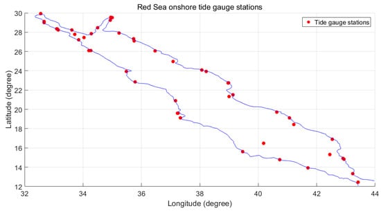 A continuous hydrodynamic model is required to develop a continues chart datum where the LAT to MSL model serration model can be estimated. The regional hydrodynamic models for the Red Sea were developed and a reasonable agreement between the tidal values estimated from the model and the tidal values estimated from tide observations was found [,,]. However, the regional Red Sea tidal models were developed with a limited number of tide gauge observations and the model cannot be utilized to estimate a reliable LAT to MSL model in the Red Sea region. Therefore, the LAT to MSL model in this paper was developed using well established hydrodynamic ocean models, namely the WebTide model [], Finite Element Solution 2014 (FES2014) ocean model [], Technical University of Denmark 10 (DTU10) ocean model [], and Empirical Ocean Tide Model 11a (EOT11a) ocean model []. The tidal constituents of these four ocean models are publicly and freely available to access through their websites.