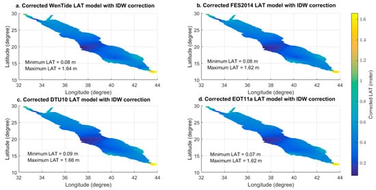Corrected WebTide (a), FES2014 (b), DTU10 (c), and EOT11a (d) LAT models with Inverse Distance Weighted (IDW) correction.