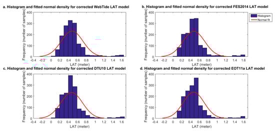 Histogram distributions and fitted normal densities for corrected WebTide (a), FES2014 (b), DTU10 (c), and EOT11a (d) LAT models with IDW correction.
