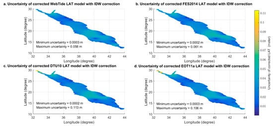 Uncertainty of corrected WebTide (a), FES2014 (b), DTU10 (c), and EOT11a (d) LAT models with IDW correction.
