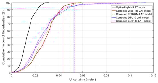To validate the accuracy of the developed model, the comparison was made between the optimal hybrid LAT model developed from multiple hydrodynamic ocean model hybridization using the MLE method and individual LAT models estimated from individual hydrodynamic ocean models using individual WebTide, FES2014, DTU10, or EOT11a ocean models based on the associated uncertainties. Figure 8 shows the cumulative uncertainties distributions estimated from the uncertainties associated with the optimal hybrid LAT model and the cumulative uncertainties distributions estimated from the uncertainties associated with the individual LAT models. The cumulative uncertainties distributions in Figure 9 was employed to estimate the uncertainties at a 95% confidence level for the optimal hybrid LAT model and the individual LAT models. Table 2 shows the maximum uncertainties and the uncertainties estimated at a 95% confidence level from the optimal hybrid LAT model and the individual LAT models. It can be seen from Table 2 that the developed optimal hybrid LAT model associated with about 2.4 cm of uncertainty at a 95% confidence level is superior to the individual LAT models associated with about 5 cm of uncertainty on average at a 95% confidence level with about 50% improvement on average. Moreover, Figure 10 shows the differences between the corrected LAT values estimated from the four ocean models (WebTide, FES2014, DTU10, and EOT11a) and the optimal LAT values estimated from the developed hybrid model. It is shown that the differences between the corrected LAT values from the four models and the optimal LAT values hybrid model range from –21 cm to +13 cm with RMS error of 5 cm at a 95% confidence level. It should be noted that the RMS error is consistent with the estimated uncertainties of individual ocean models shown in Table 2.
