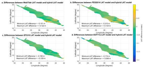 Differences between corrected LAT WebTide model (a), corrected FES2014 model (b), corrected LAT DTU10 model (c), and corrected LAT EOT11a model (d), and optimal hybrid LAT model.
