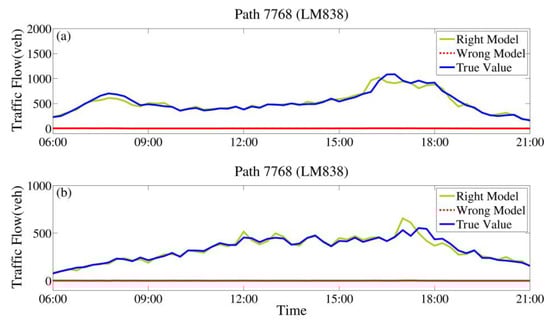 As an example to display the filter divergence more intuitively, the traffic flow forecasting results of path 7768 (LM838), which is a path of England’s highway system, were obtained using the correct and incorrect models. Without loss of generality, the forecasting results on workday Monday and non-workday Saturday are given. Figure 2 shows that the filter-divergence phenomenon occurred on both Monday and Saturday using the incorrect model with the S-DA system based on the KF method.