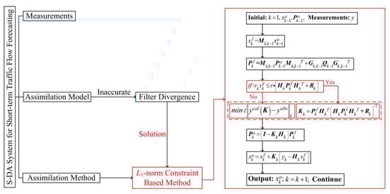 The remainder of the paper is organized as follows. In Section 2, an inaccurate S-DA system that generated filter divergence for short-term traffic flow forecasting is presented. In Section 3, a filter-divergence suppression method based on the L1-norm constraint is proposed. Section 4 gives a numerical example. In Section 5, short-term traffic flow forecasting application experiments are described. Section 6 presents the results and Section 7 presents our conclusions.