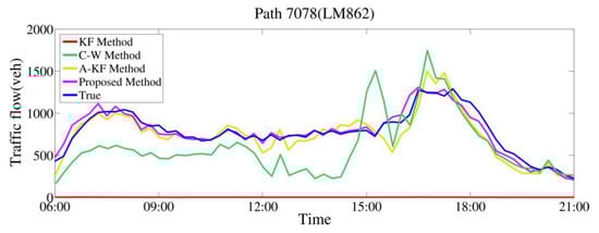 Traffic flow predictions on workday Monday and non-workday Sunday for path 7078(LM862), which was part of the study area shown in Figure 5b, were computed first using the KF method, the C-W method, the A-KF method, and the proposed L1-norm constraint-based method under the incorrect model shown in Equation (9) as an example to demonstrate the performance of the proposed method in detail and the results are shown in Figure 6 and Figure 7, respectively. The results presented showed that filter divergence occurred when only using the KF method under the incorrect model; however, the filter divergence was alleviated to different degrees after using the C-W, A-KF, and L1-norm constraint-based methods. Furthermore, the true values were added to verify the effectiveness of these three filter-divergence suppression methods. Results showed that the best performance for filter-divergence suppression was obtained using the L1-norm constraint-based method on both Monday and Sunday.
