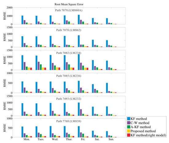 Table 2 displays the RMSE and MAPE (%) values of the assimilation results acquired from the original KF method, the C-W method, the A-KF, and the proposed method based on the L1-norm constraint.