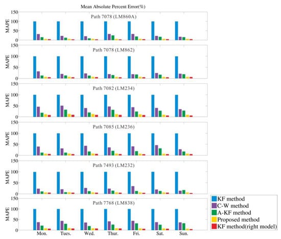 Table 8 presents the differences in the average RMSE and MAPE values of all paths for the filter-divergence suppression methods under the incorrect model and the KF method under the correct model. The average RMSE and MAPE values acquired using the L1-norm constraint-based method were much closer to those obtained using the KF method under the correct model. On workday Monday, the difference in the average RMSE and MAPE values between the C-W and KF methods under the correct model was 177.69 and 24.44%, respectively. The corresponding differences between the A-KF and KF methods were 100.44 and 14.49%, respectively. The differences in the average RMSE and MAPE values between the proposed L1-norm constraint-based method and the KF method were 15.77 and 2.22% on Monday, respectively. Similar results were obtained for non-workday Saturday. The smallest average RMSE and MAPE differences were 11.77 and 2.44%, respectively, which were acquired using the L1-norm constraint-based method.