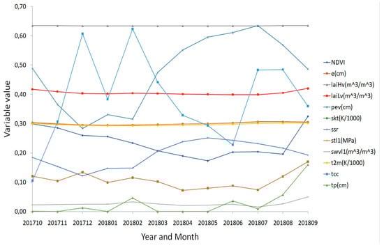 Figure 2 shows, as an example, the temporal evolution of the NDVI and meteorological variables in Comondú municipality, Baja California, from October 2017 to September 2018. This state corresponds to irrigated farmer system for both cycles. The yield production for this year was 38 ton/ha for the winter cycle and 31 ton/ha for the summer cycle. Aiming to represent all the variables in one figure, skt and t2m have been divided by 1000, stl1 was measured in MPa, and tp, e, pev, and tp were measured in cm.