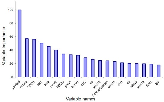 We evaluated the statistical significance of each variable in the best performing models and cycle. The variable importance was calculated using the varImp function included in the caret package [38] and scaled to 100 for the sake of visibility. Figure 3 and 4 show the 20 most important variables for the rf model using the 3-month scenario (winter cycle), and svmP model using the 5-month scenario (summer cycle).