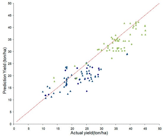 Comparison between predicted and actual yields in the independent dataset (2017–2018). Navy blue color represents rain-fed crops, green color represents irrigated crops, diamond-shaped objects represent prediction and actual yield for the rf model (3-month scenario, winter cycle) and triangle-shape objects represent prediction and actual yield for the svmP model (5-month scenario, summer cycle).