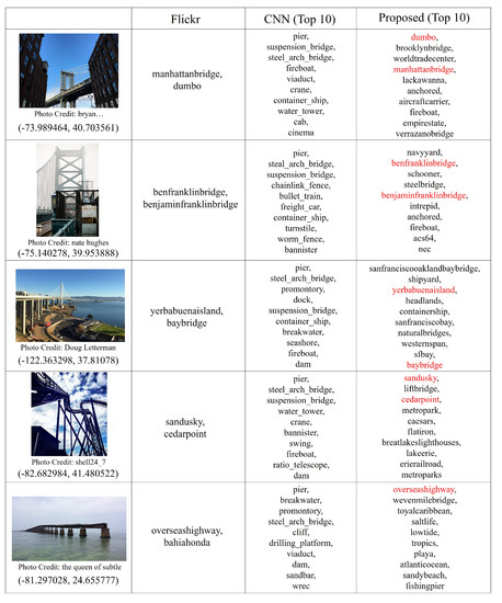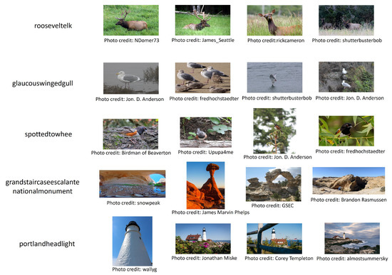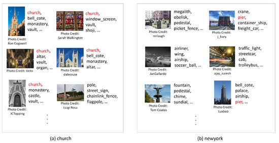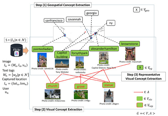 On the other hand, there have been some attempts to automatically extract the knowledge about concepts or create image datasets of concepts by using internet search engines or on-line image sharing services such as Flickr [6], where the images are uploaded with manually assigned textual tags [7,8,9,10,11,12,13]. Especially, since Flickr images are also assigned with geo-coordinates of their captured locations, they have been used for extracting the knowledge about geospatial concepts [14,15,16] such as their visual and geospatial features which are necessary to recognize each concept in images. Since people capture images of anything that attracts their attentions and upload them to Flickr, using Flickr images as the information source would enable us to obtain prior information about any type of fine-grained geospatial concepts that people would be interested in, as long as they are captured only at specific locations by several people. The expected geospatial concepts whose prior information can be extracted from Flickr images include local places of interest, local species, transportation systems, local landscape styles, and so forth.