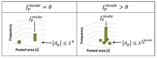 How the area-based frequency histogram is used to determine if represents a geospatial concept. Intuitively, by using the same threshold , the threshold which represents the maximum number of sub-areas for extracting the geospatial concepts gets larger as the peak of the frequency histogram gets higher.