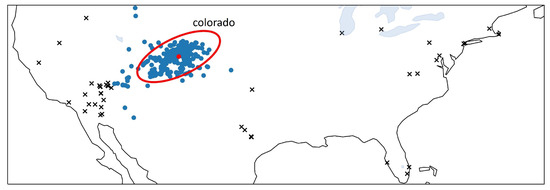 How geospatial features of geospatial concepts are obtained by applying Mean Shift clustering to when . Cross marks represent the removed and blue marks represent the points forming a cluster. The red ellipse represents the 95% confidence interval based on the mean and covariance matrix of the bivariate normal distribution fitted to the blue marks.