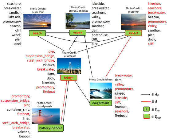 Figure 5 shows an example. Here, batteryspencer and niagarafalls are the visual geospatial concepts. The most frequent categories predicted by CNN for each visual concept are shown with an example image. The black edges represent the semantically related and visually similar concept pairs when and are directed from each child to its parents. For each visual geospatial concept, the furthest either directly or indirectly reachable and visually similar concepts are determined as its representative visual concepts, which are indicated by red edges. The four visual concepts—bridge, beach, water, and sunset are all reachable both from batteryspencer and from niagarafalls. However, since only bridge is visually similar to batteryspencer (), bridge is determined as the representative visual concept of batteryspencer. On the other hand, all four visual concepts are visually similar to niagarafalls. Thus, the furthest concept sunset is determined as the representative visual concept of niagarafalls. The categories in red are the common categories between each pair of visual geospatial concept and its representative concept.