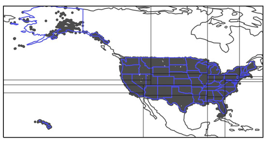 How the United States was divided into sub-areas. The dark circles represent the geographical coordinates of the 2,206,873 images. The whole area, which is the minimum bounding box containing all coordinates, is divided so that each sub-area has the same number of images.