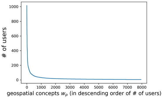 Number of users for extracted geospatial concepts , where is ranked in the descending order of the number of users. Examples of the geospatial concepts used by more than 100 users are mostly names of states, big cities, or popular places such as manhattan, centralpark, chinatown, and hollywood.