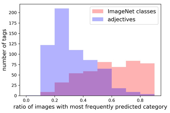 Further, in order to evaluate the effects of the parameters to examine the uniformity of visual appearances of concepts, we have collected classes from ImageNet [25] as the examples of visual concepts and English adjectives as the examples of non-visual concepts, both of which are tagged to Flickr images. Figure 9 shows the distributions of the ratios of the images attached with most frequent category for each type of concepts when . Accordingly, we set . The ratio is over for 70% of ImageNet classes, while the ratio is under for 85% of adjectives.