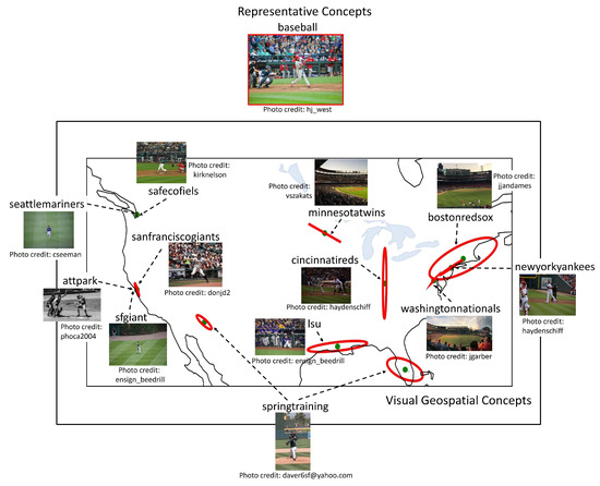 Examples of visual geospatial concepts represented by a visual concept baseball. The edges among the visual geospatial concepts and baseball are omitted for visual clarity.