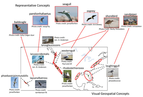 Examples of visual geospatial concepts represented by a visual concept seagull. They can be represented by multiple visually similar visual concepts. Only the edges among the visual geospatial concepts and visual concepts other than seagull are presented for visual clarity.