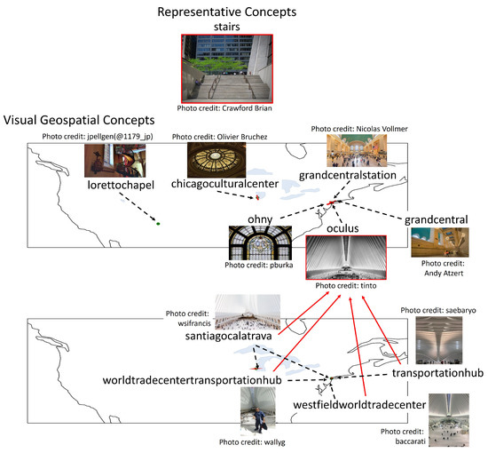 Examples of visual geospatial concepts represented by a visual concept stairs. The visual geospatial concepts themselves can also represent other visual geospatial concepts. The visual concept stairs represent the visual geospatial concepts shown in the middle layer: lorettochapel, chicagoculturalcenter, grandcentralstation, grandcentral, ohny, and oculus. oculus represents the visual geospatial concepts in the bottom layer. Only the edges among oculus and other visual geospatial concepts are presented for visual clarity.