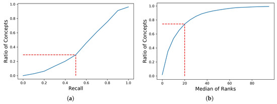 The image recognition results when the recognition targets were the 3585 visual geospatial concepts which was actually attached to at least 5 test images. (a) Cumulative distribution of recall rates. (b) Cumulative distribution of median ranks.
