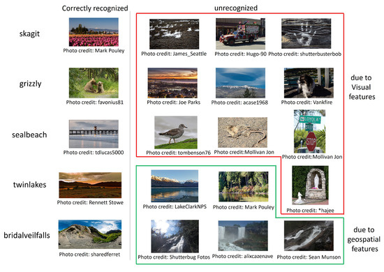 On the other hand, since Flickr images captured in a single year are not sufficient to construct a complete graph, our method failed to recognize some correct test images or falsely recognized some incorrect test images. For example, although there are multiple waterfalls called bridal veil falls in the United States, most images tagged with bridalveilfalls were captured in Yosemite National Park in California in 2017. The 2 test images for bridalveilfalls on the right in Figure 16 correspond to Niagara Falls in New York, which is also called bridal veil falls, and they were not correctly recognized since the constructed graph did not contain its locations as the geospatial features of bridalveilfalls. Especially for geospatial concepts which can be observed in rather wide areas such as animals or transportation systems such as trains and airplanes, the images captured in a single year were not sufficient to extract complete geospatial features. While representative visual concepts can complement the visual features for their subordinate fine-grained geospatial concepts, the geospatial features need to be complemented from other information sources.