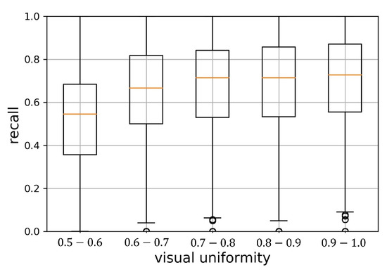 Relations between visual uniformity and recall of geo-aware image recognition.