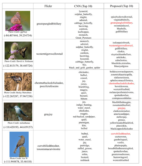 Although there is still a space for improvement, the constructed geospatial concept graph was able to realize the geo-aware fine-grained image recognition as shown in Figure 18 and Figure 19. By comparing the top 10 tags provided by our method with the Flickr tags, these figures show different fine-grained concepts were successfully recognized for the visually similar images captured at different locations. Further, visually dissimilar images captured at similar locations were also properly recognized. For example, the 3rd image in Figure 18 can also be recognized as westerntigerswallowtail or chestnutbackedchickadee, which were recognized for other images in Figure 19, based only on its captured location. However, based on the visual features, it was properly recognized as yerbabuenaisland or baybridge. The recognized geospatial concepts which are different from the Flickr tags can also be considered to be related to the test images, which also indicates the correctness of the information in the constructed geospatial concept graph.